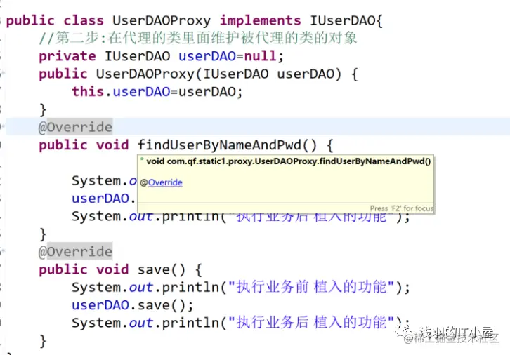 什么是设计模式? 设计模式不是技术、也不是什么框架、设计模式只是前人的一个工作的总结、在实现某一个功能的时候 怎样来减少代码之间的耦合性、以及如何实现高内聚低耦合。设计模式说白了就是按照一定的步骤来完成相应的一个功能 这个就称为设计模式 代理的设计模式主要用来解决一个什么问题呢? 第一个:监控目录一个类里面方法的执行 第二个:在类里面某一个方法执行的前后 动态的植入代码