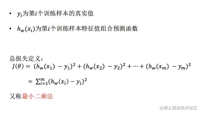 就是将每个预测值与真实值的误差的平方和,最终就是总损失。优化损失函数就是为了找到能造成最小误差的w(每个特征的权重)。