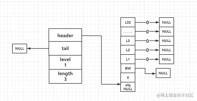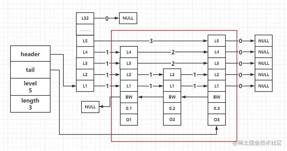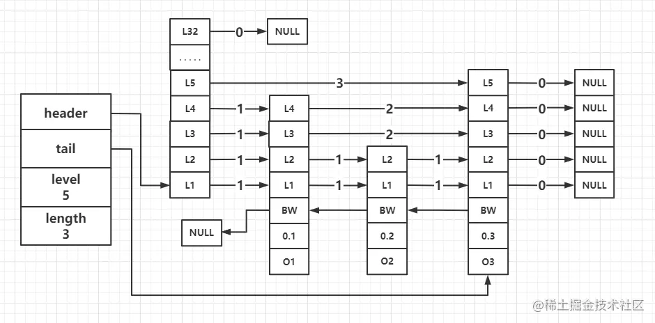 属性 level 则保存了跳跃列表节点中层高最大的那个节点的层数量,这里的节点中是不包括表头节点的。获取节点中层高最大的那个节点的层数量时间复杂度依旧是 O(1)