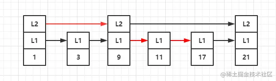 在跳跃列表要查找分值为17的节点的路线如红色箭头所示。