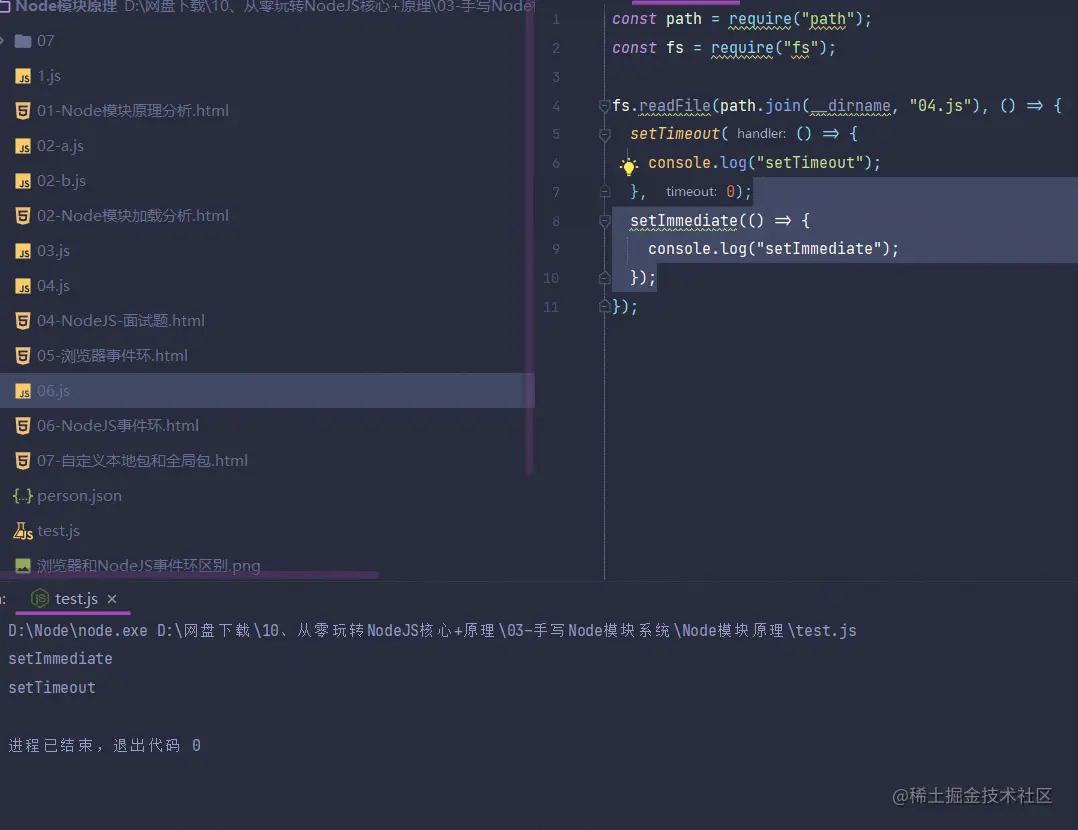 上面是不是说过执行完一个Node事件环中的队列以后,就会去查看微任务是否有满足条件的代码,如果满足就立即执行,不满足就不执行,执行完timers队列以后,微任务是不是没有任务,然后就会跳转到check队列,然后执行check队列,最后打印出setImmediate