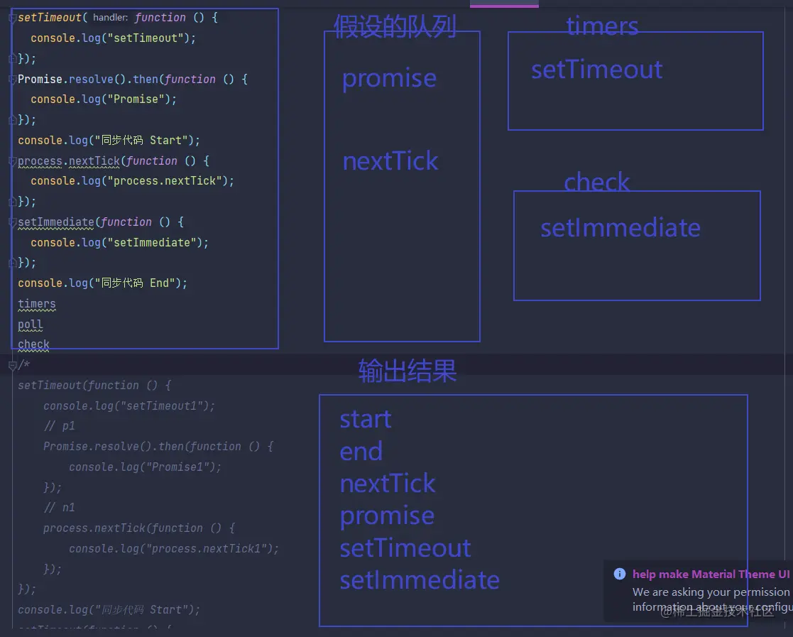 微任务执行完毕以后,是不是就会按照Node的事件环的队列顺序来执行,setTimeout是属于timers队列的, setImmediate是属于check队列的,timers队列优先级比check高,就会先执行timers的队列就打印出了setTimeout