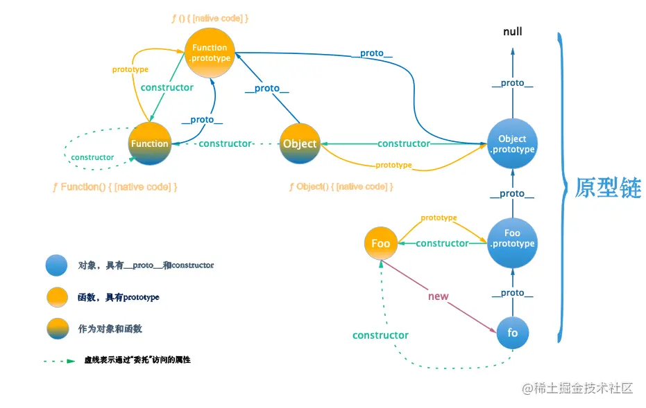 首先通过Function.__proto__找到原型对象(Function.prototype),在原型对象中存在constructor属性。最后通过Function.prototype的constructor再找到Function的constructor。(对应图例的虚线部分)