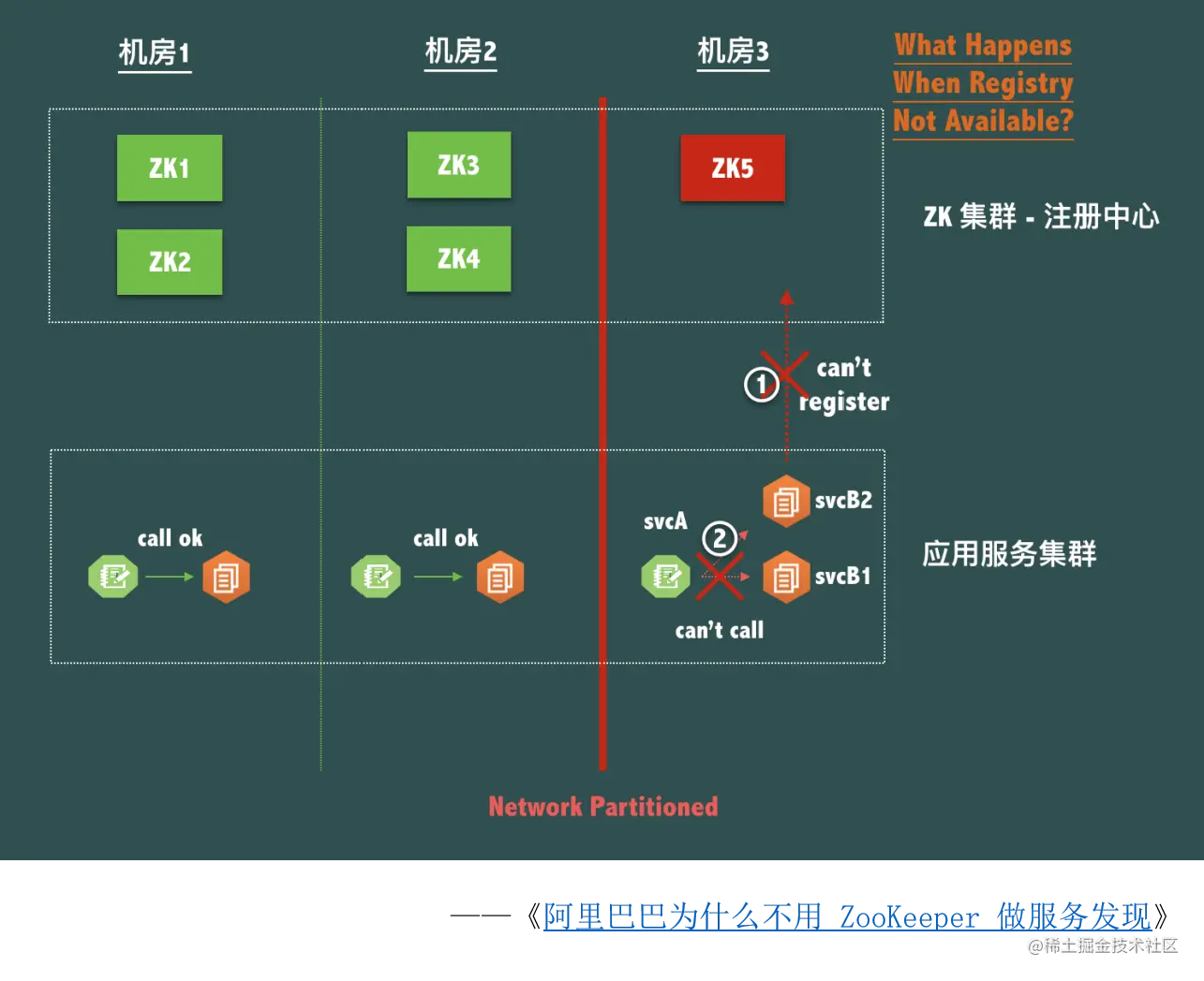 机房3与其他机房通讯断开,成为孤岛,发生网络分区。此时ZK5无法写入,svcB无法重启、 扩容、缩容。导致同机房的svcA无法调用svcB服务