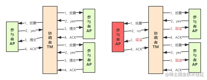 当一个事务操作需要跨越多个分布式节点的时候,为了保持事务处理的ACID特性,就需要引入一个“协调者”TM(Transaction manager )来统一调度所有分布式节点的执行逻辑,这些被调度的分布式节点被称为AP(Application Program)。TM负责调度AP的行为,并最终决定这些AP是否要把事务真正进行提交;整个事务是分为两个阶段:投票、提交。
