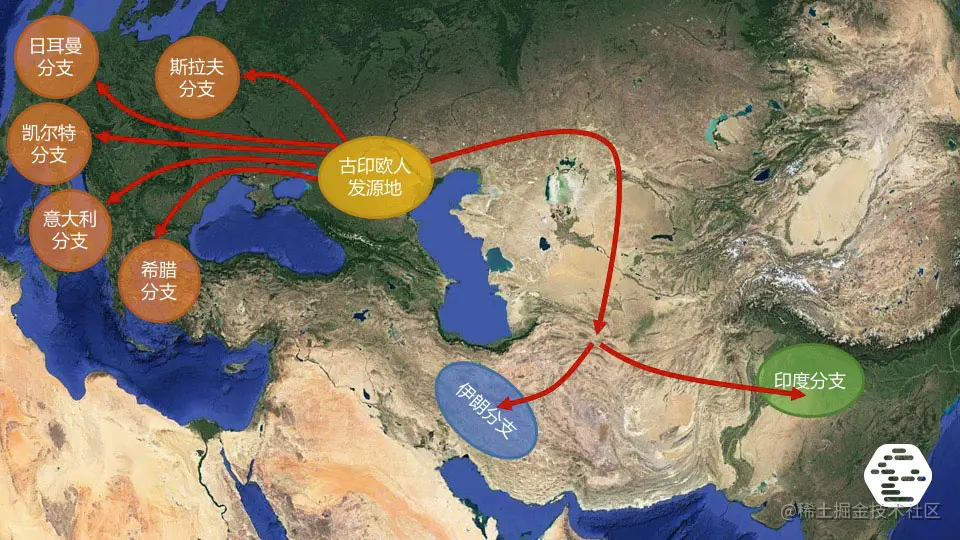 一部分向南进入中东,在伊朗高原一带建立了波斯帝国,演变为今天的伊朗人。