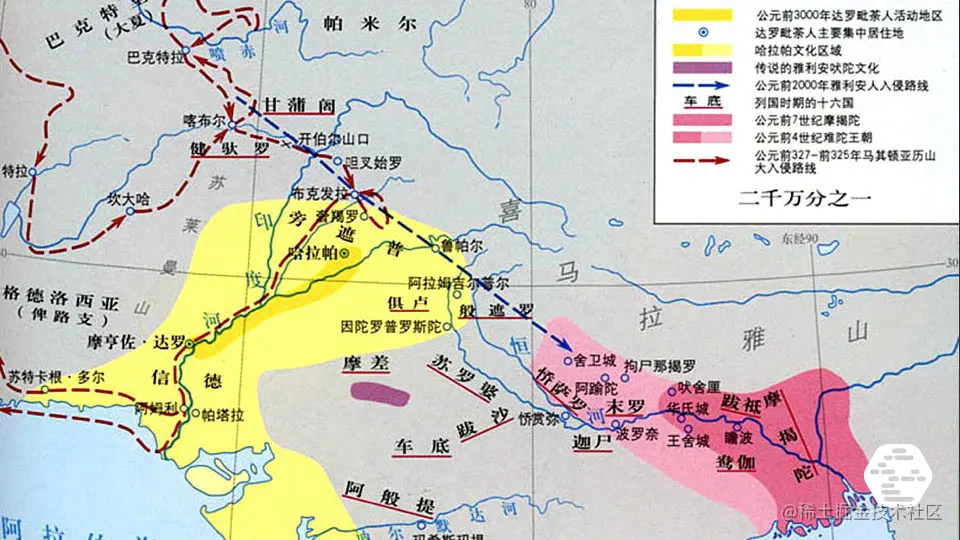另一部分继续向东南方向移动,越过兴都库什山脉(今阿富汗境内),约在公元前1200年左右来到印度河流域。