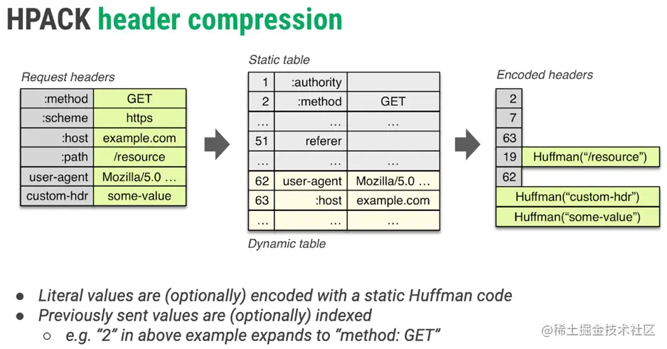 因为每个HTTP 报文都要传输臃肿的首部字段导致的网络效率降低,解决思路,通信双方可以都维护一张HTTP 首部字段索引列表,报文中只传输对应字段的索引值,就能大大压缩报文首部的长度,提高网络利用率。 HTTP/2 在客户端与服务器端都维护了一张首部字段索引列表, header 字段列表是以key - value 键值对元素构成的有序集合,每个header 字段元素都映射为一个索引值,报文中使用header 字段的索引值进行二进制编码传输,显然比HTTP/1.1 直接使用header 字段ASCII 编码传输,数据量小得多,这种减少header 字段传输开销的技术可以称为首部压缩HPACK。