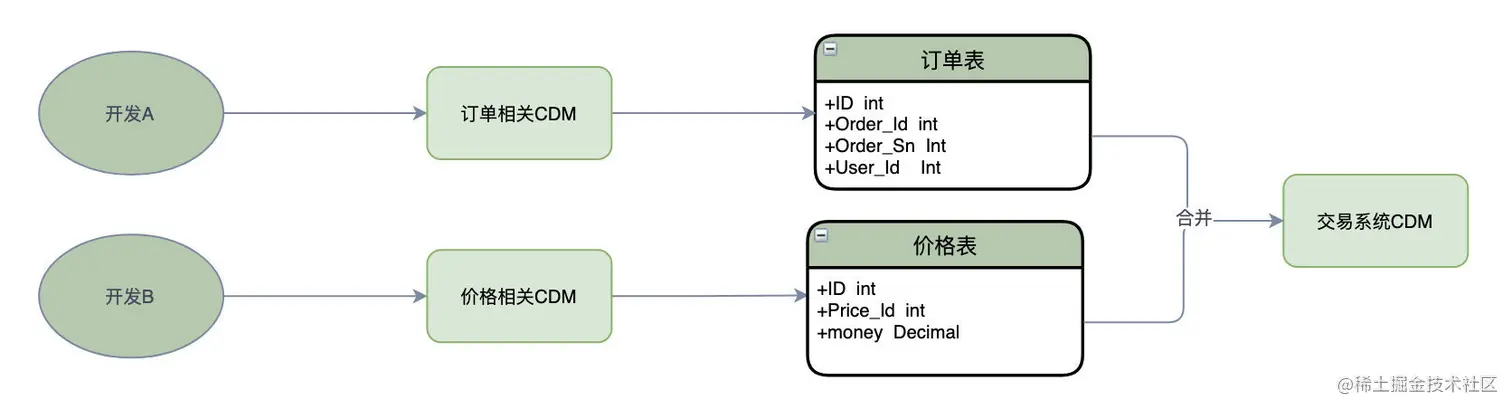 首先每个人要根据需求分析抽象出自己的实体Entity及之间的关系Relationship,设计初步完成之后就要开会讨论了,把每个开发的ER图合并起来,就得到全局交易系统的CDM。
