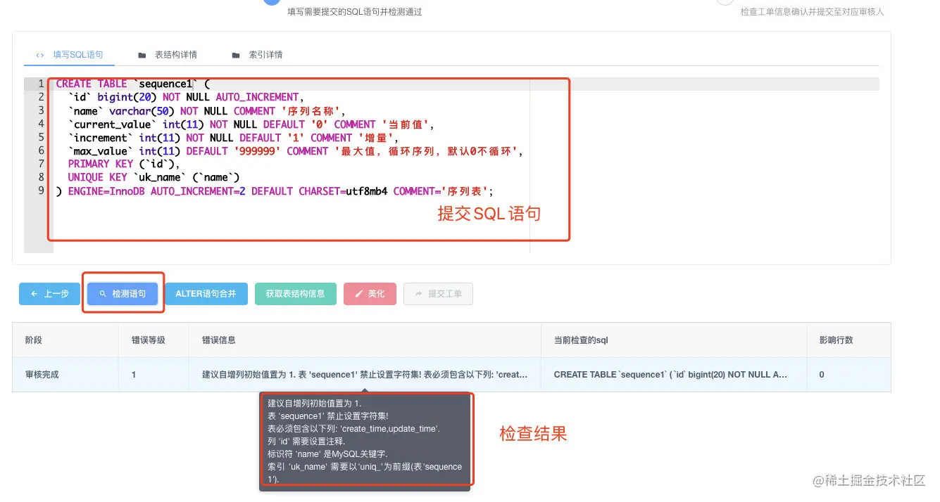 检测通过后就可以提交工单了,审核通过后就会自动执行DDL脚本建库。