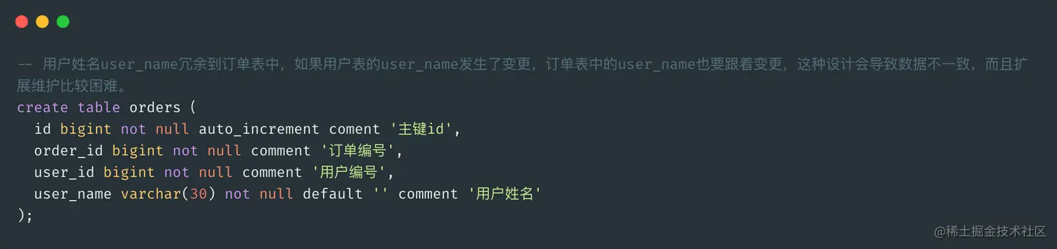 这个也不难理解,对于订单表orders来讲,是要存储用户表users的user_id,要明确哪个用户下的单,有些业务场景是要获取users表的用户姓名user_name,为了减少orders和users表的关联查询,将user_name冗余到orders表中,这种设计就违反了3NF,减少数据冗余,可以通过主外键进行表之间连接。