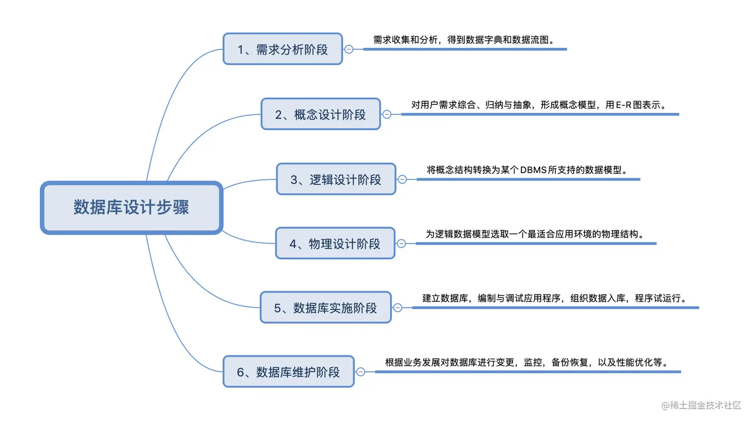 在问题定义和可行性分析都做好的前提下,就可以进入需求分析阶段了,通常来讲,一般都有产品部,需求分析往往都是由产品经理和客户去沟通落地形成PRD,跟开发沟通之后,就可以根据需求分析做数据库设计了,下面主要讨论下数据库设计的步骤以及每个阶段要完成的内容。