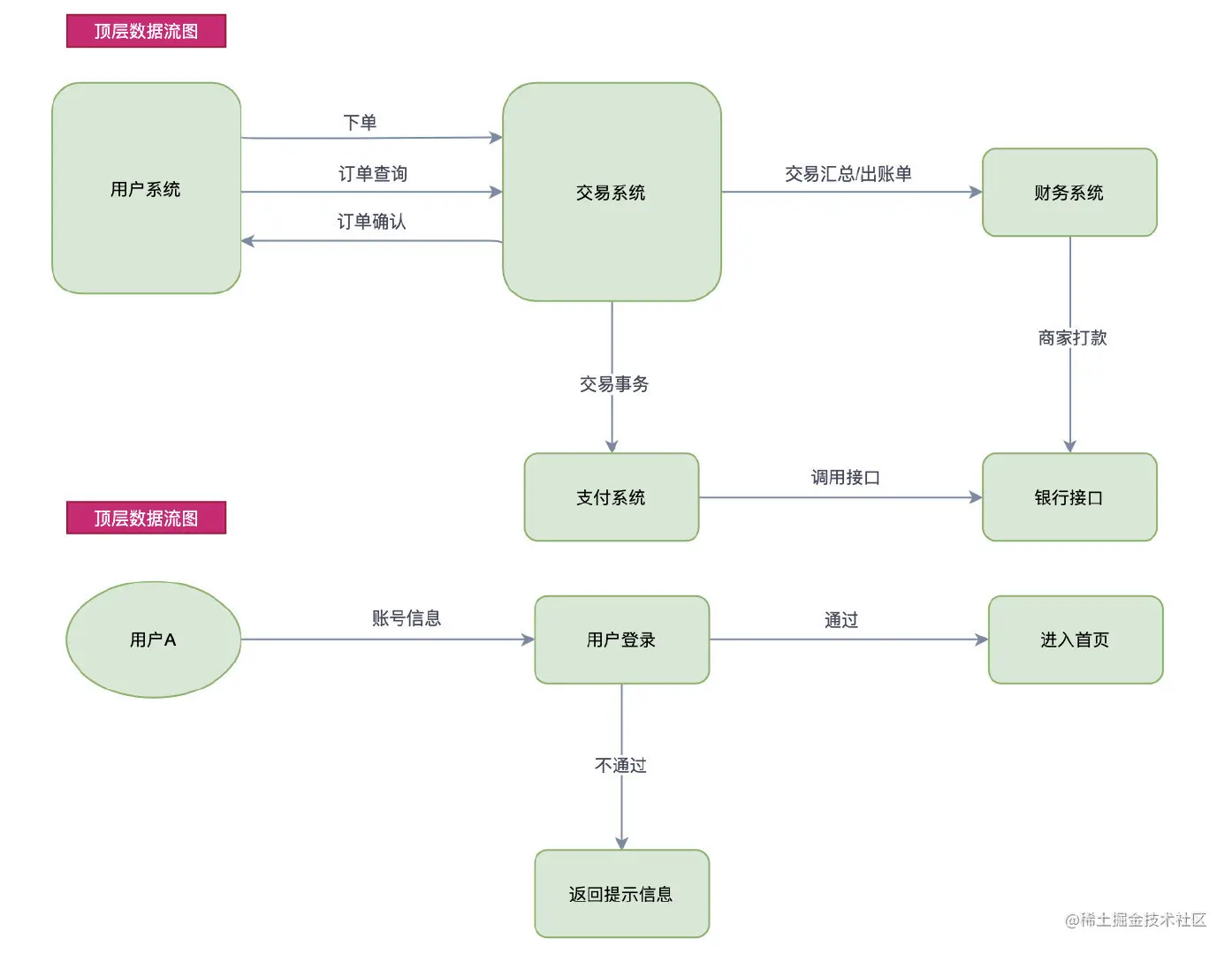 下面是一个交易系统的DFD,需要先画出顶层数据流图,主要包括系统子模块之间的交互,然后再进一步对子模块进行分解。