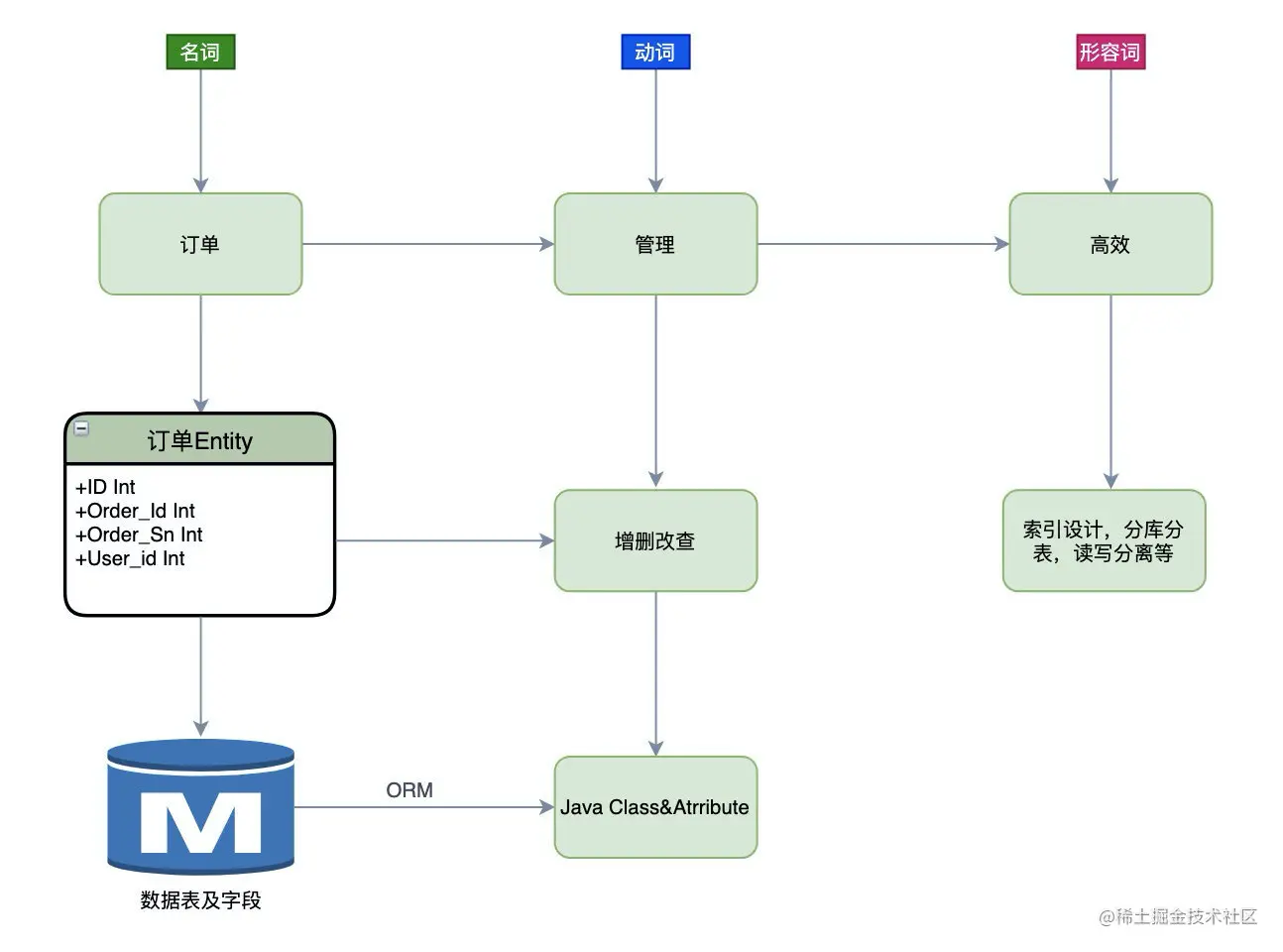 名称:订单,订单就是一个Entity,也可以拆分成多个Entity,抽象出每个Entity的Attribute(前期可能由于需求不明确,可以只做确认的内容),Entity通过PowerDesigner的正向工程转换成数据库里的数据表,Attribute就是表的字段;数据表通过ORM映射到Java里的就是Class,字段就是private属性。