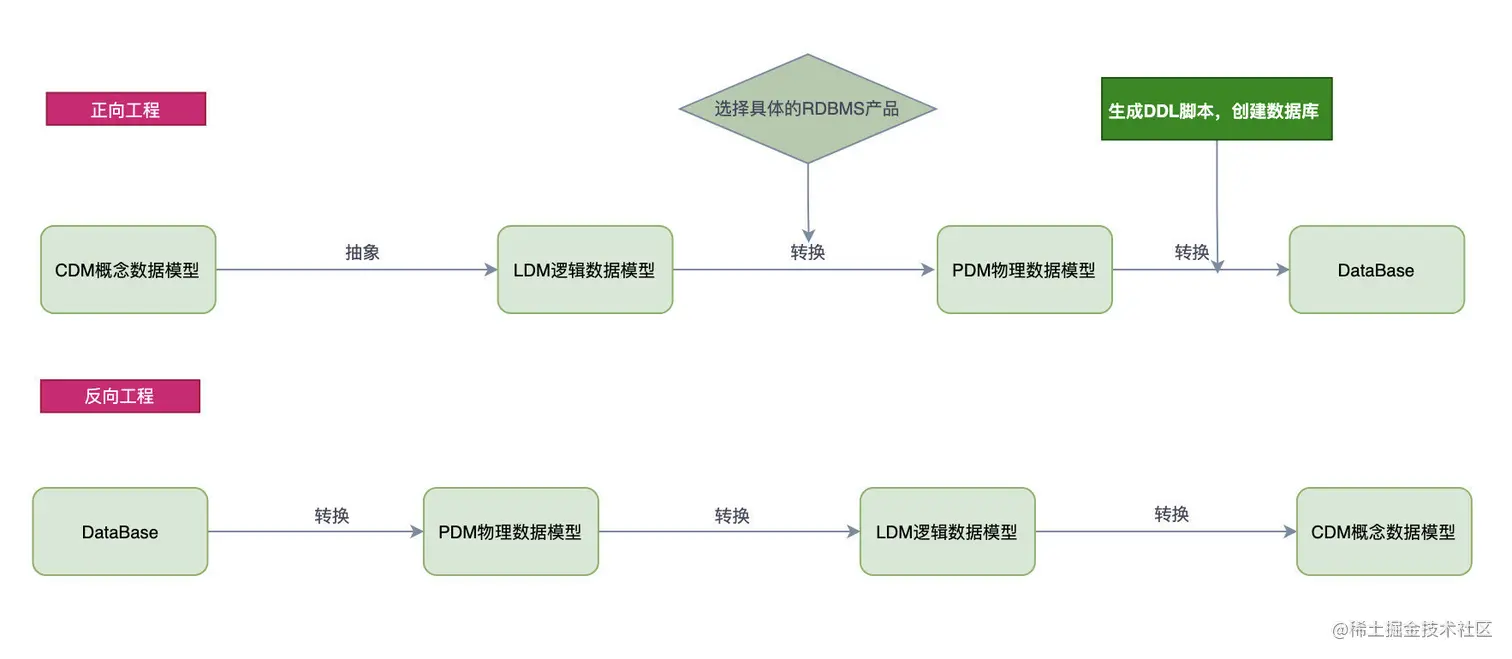 在实际的开发中,常用E-R(Entity-Relationship:实体关系)图来表示,常用的工具PowerDesigner,可以实现CDM(概念数据模型)->LDM(逻辑数据模型)->PDM(物理数据模型)->Database的自动转换,这个过程称为正向工程,如果有database建库脚本,也可以通过PowerDesigner工具生成CDM,即Database->PDM->LDM->CDM,称为反向工程。