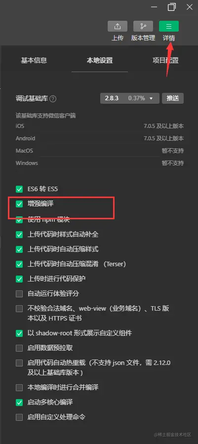 设置在小程序端也支持Async/Await 丁七岁 2020-12-14 167 阅读1分钟 看官方的这个: 下载1.02.1904282 以及之后版本的开发工具,然后把下面的这个增强编译勾上 就可以了