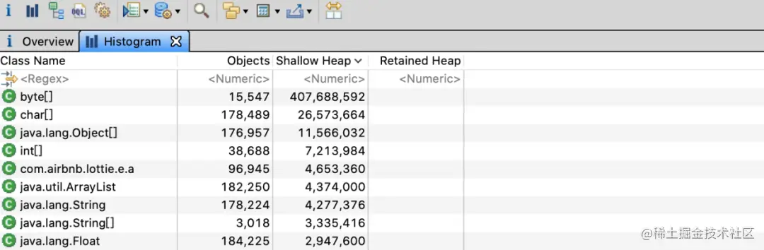 - OOM 时占比最大的对象通常是 Bitmap/String,这些对象的数据主要消耗在 byte[] 、 char[];