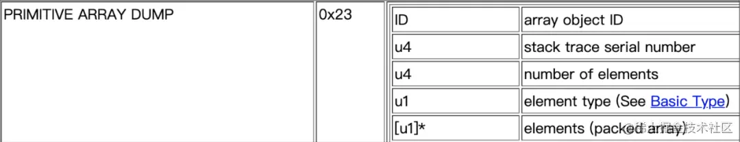 Android 上 dump 出的 hprof 文件虽然也遵循 hprof格式,但也有所不同,典型的是其一级TAG只有:STRING、LOAD_CLASS、HPROF_TAG_STACK_TRACE、HEAP_DUMP_SEGMENT、HEAP_DUMP_END。HEAP_DUMP_SEGMENT 又分了很多二级 TAG ,这些二级 TAG 中既有标准 hprof 定义的,也有 Android 自定义的 TAG。跟裁剪关系比较紧密的二级 TAG 是 PRIMITIVE_ARRAY_DUMP,存放的是诸如 byte[] 、char[] 、int[]等类型的数据,其格式如图所示: