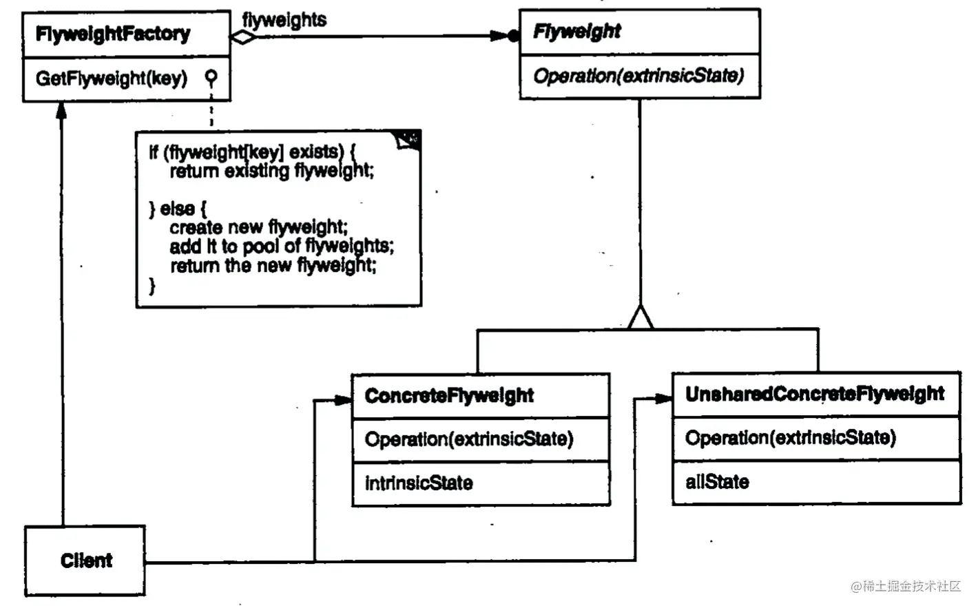 - FlyweightFactory: 创建并管理 Flyweight 对象,通过其返回的 Flyweight 对象,如果已创建,则会返回之前创建的那个,没有的话才会创建一个新的。