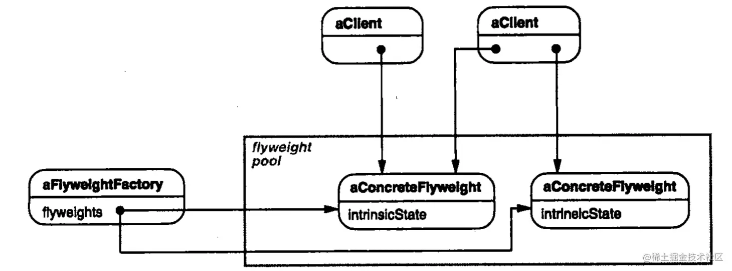 通过第二个图可以明显看到,两个不同的 Client 持有了相同 aConcreteFlyweight 引用。