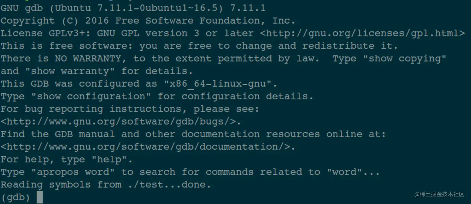 在最后一行可以看到光标在闪烁,这是gdb程序在等着我们给它下达调试命令呢。