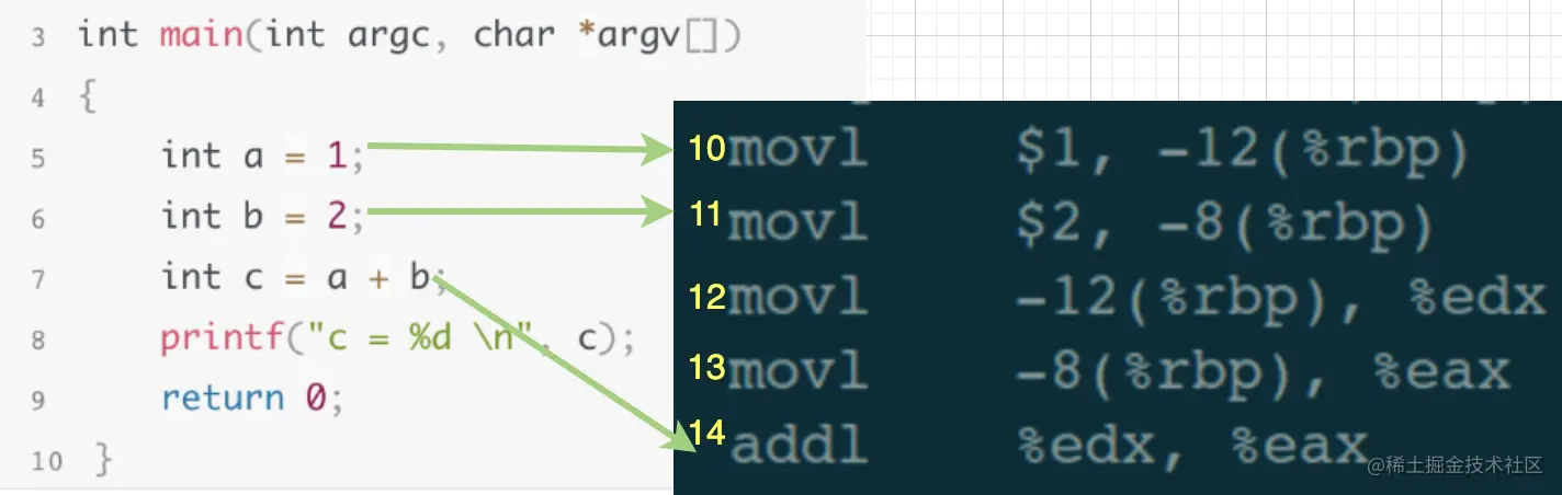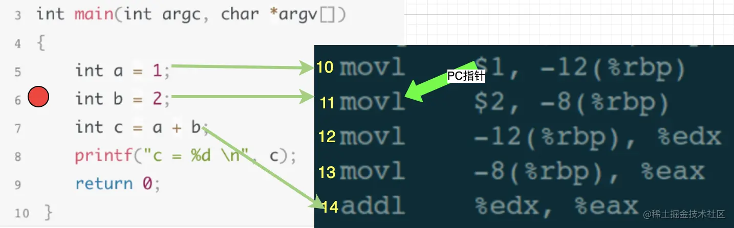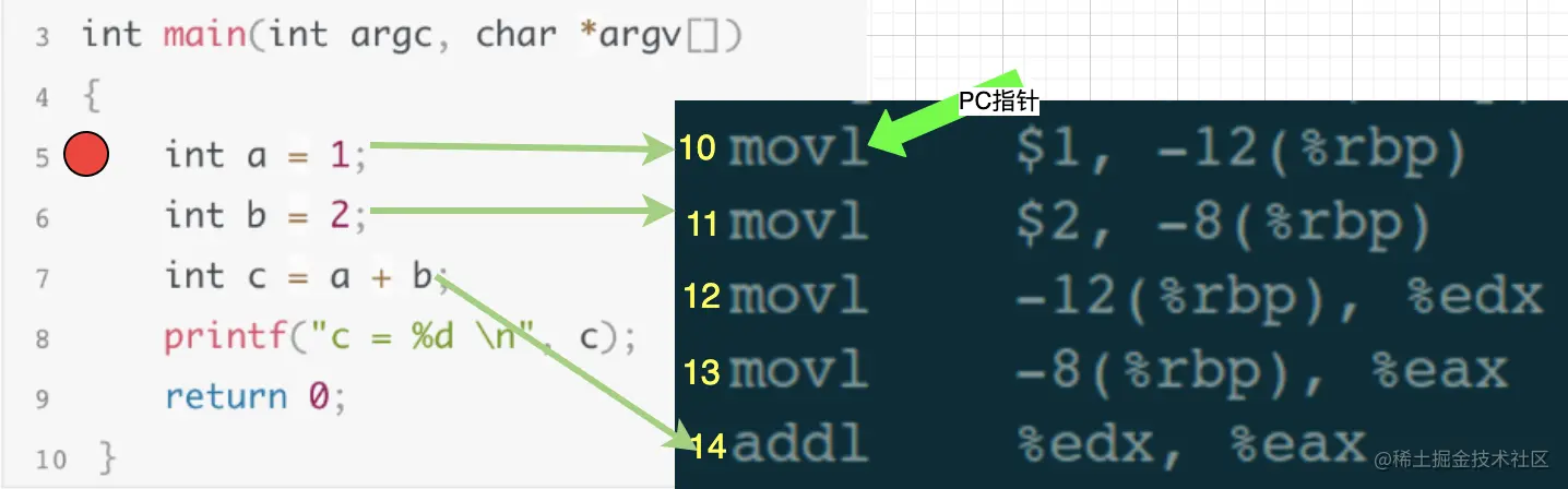 此刻,就相当于下一条执行的指令是汇编代码中的第10行,也就是源码中的第5行。从我们调试者角度看,就是被调试程序在第5行断点处暂停了下来,此时我们可以继续输入其他调试指令来debug,比如:查看变量值、查看堆栈信息、修改局部变量的值等等。