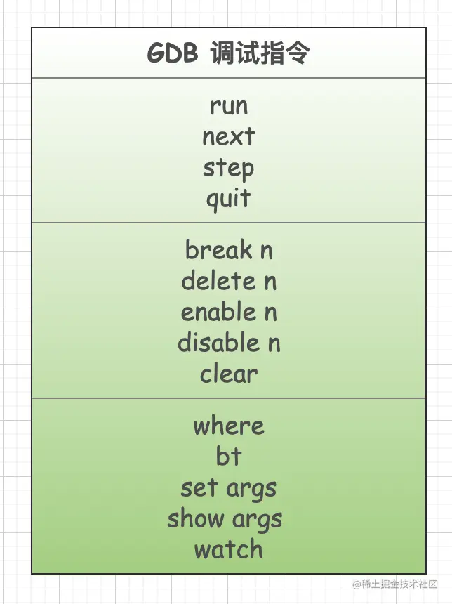 为了完整性,这里把部分GDB调试指令贴一下,有感性认识即可。