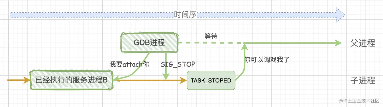 如果想对一个已经执行的进程B进行调试,那么就要在gdb这个父进程中调用ptrace(PTRACE_ATTACH,[其他参数]),此时,gdb进程会attach(绑定)到已经执行的进程B,gdb把进程B收养成为自己的子进程,而子进程B的行为等同于它进行了一次 PTRACE_TRACEME操作。此时gdb进程会发送SIGSTO信号给子进程B,子进程B接收到SIGSTOP信号后,就会暂停执行进入TASK_STOPED状态,表示自己准备好被调试了。