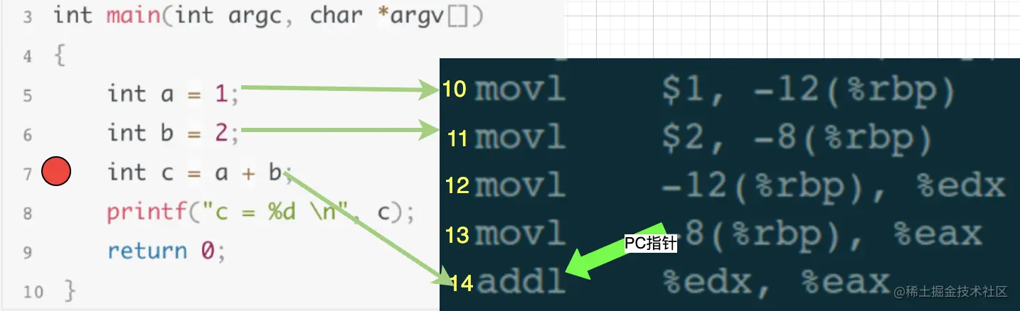 在调试窗口输入单步执行指令next,我们的目的是执行一行代码,也就是把源码中第6行代码执行完,然后停止在第7行。gdb在接收到next执行时,会计算出第7行源码,应该对应到汇编代码的第14行,于是gdb就控制汇编代码中的PC指针一直执行,直到第13行执行结束,也就是PC指向第14行时,就停止下来,然后继续等待用户输入调试指令。