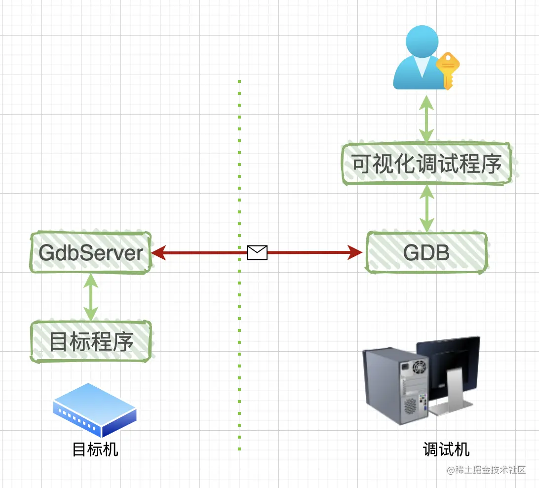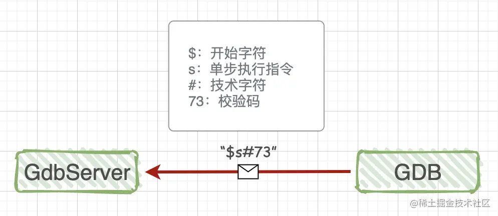 与本地调试相比,远程调试中多了一个GdbServer程序,它和目标程序都是运行在目标机中,可能是一台x86电脑或者是一个ARM板子。图中的红线表示GDB与GdbServer之间通过网络或者串口进行通讯。既然是通讯,那么肯定需要一套通讯协议:RSP协议,全称是: GDB Remote Serial Protocol(GDB远程通信协议)。