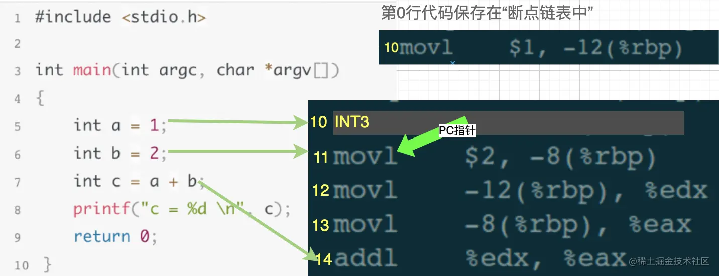 - 对第5行源码所对应的第10行汇编代码存储到断点链表中。