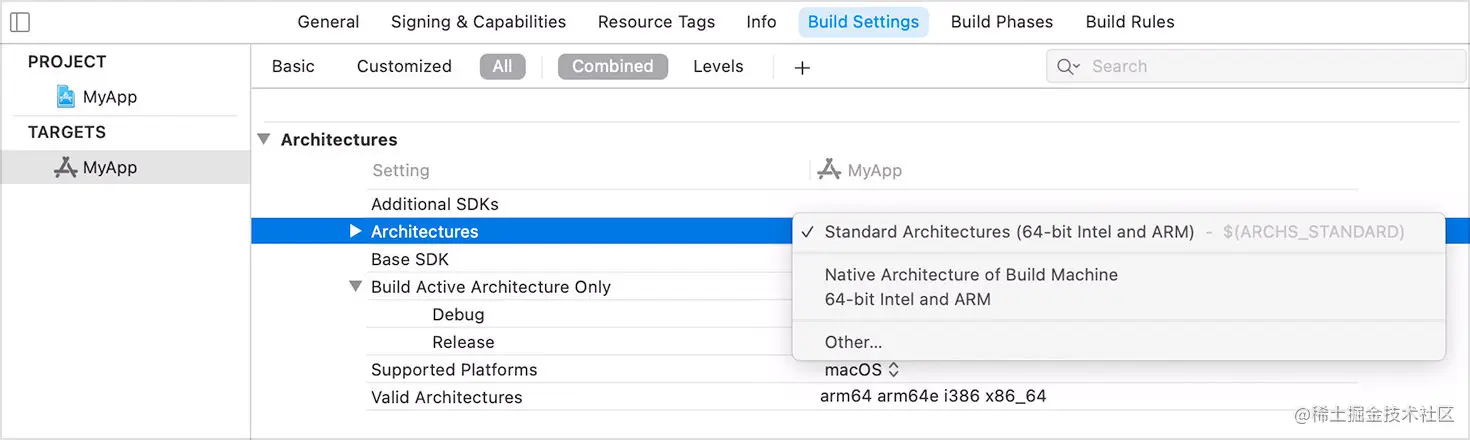 Xcode 12 及更高版本会自动将 arm64 架构添加到所有 macOS 二进制文件(包括应用程序和库)的标准架构列表中。在调试和测试过程中,在默认情况下,Xcode 仅针对当前系统架构构建版本,但是,它会为代码的 Release 版本自动构建通用二进制文件。