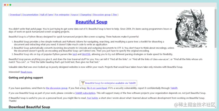 Beautiful Soup 是用Python写的一个HTML/XML的解析器,它可以很好的处理不规范标记并生成剖析树(parse tree)。 它提供简单又常用的导航(navigating),搜索以及修改剖析树的操作,它能够通过你喜欢的转换器实现惯用的文档导航,查找,修改文档的方式,简单的说,它可以大大节省你的编程时间