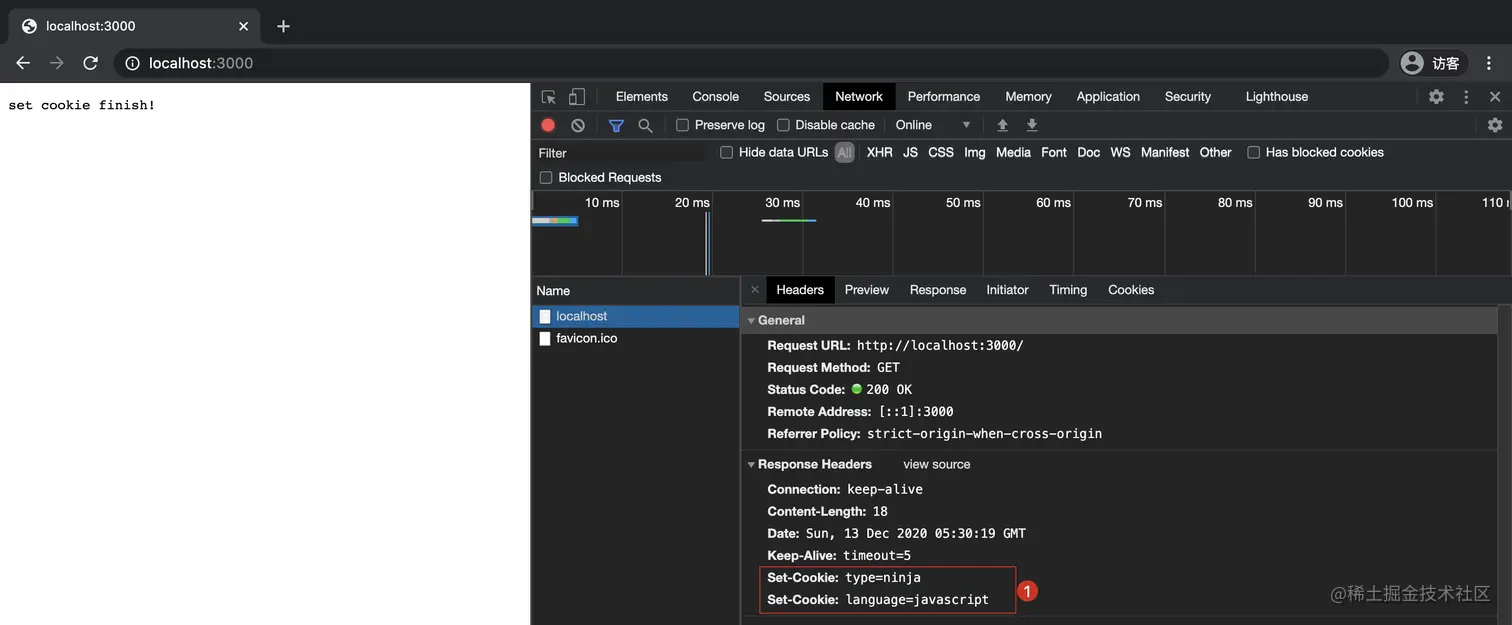 接着我们在浏览器内打开http://localhost:3000,并打开控制面板,首先我们先检查,服务器返回的headers内是否有Set-Cookie字段