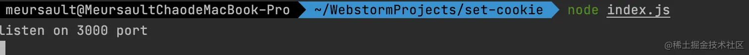 下面我们先创建一个set-cookie的文件夹,接着将上面的示例代码粘贴进入新建的index.js文件内,运行node index.js