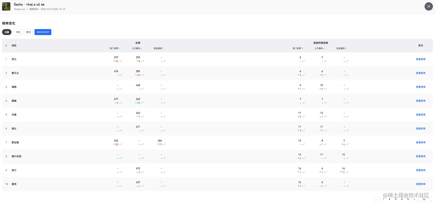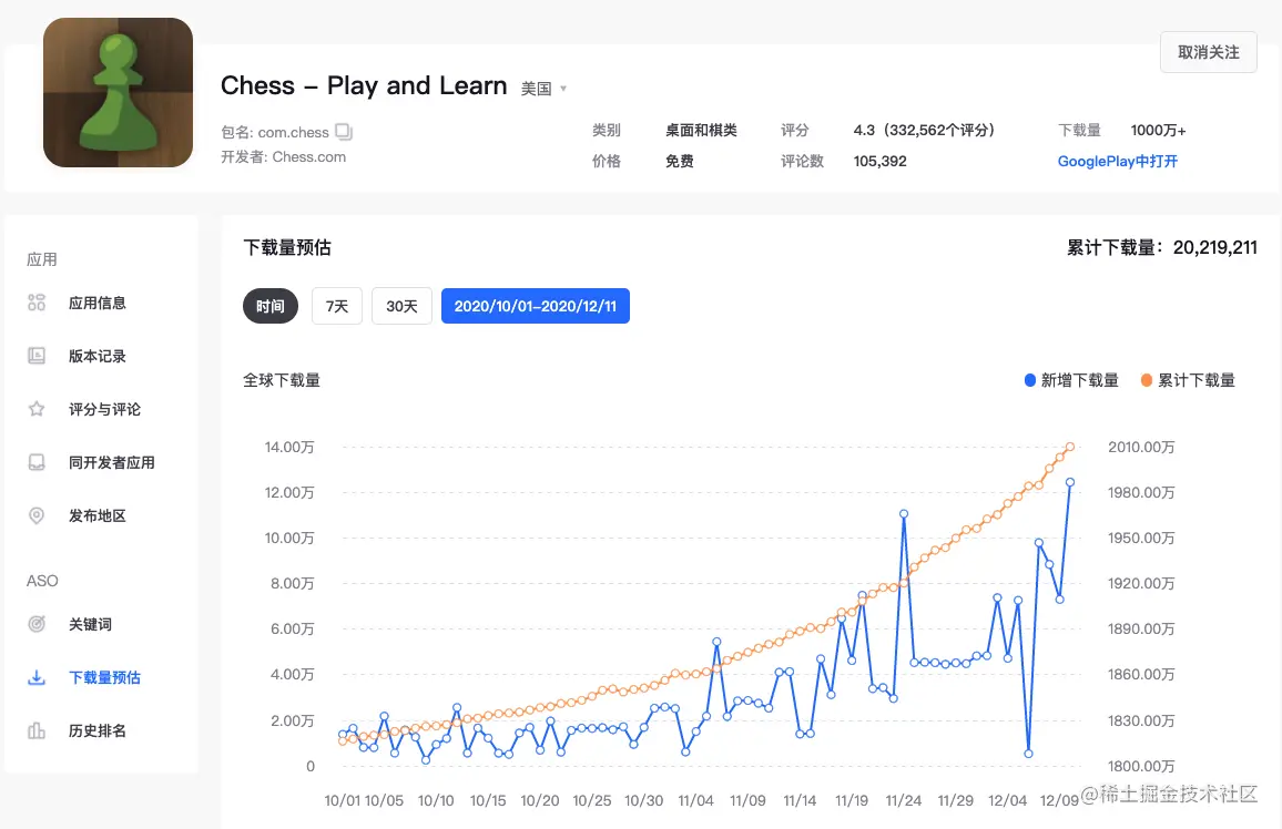 在美国地区,『chess』关键词下排名靠前的应用Chess - Play and Learn自10月底开始,下载量显著增加。这样的增长并不仅仅出现在美国,10月27日Chess - Play and Learn在全球各地的桌面和棋类榜排名都有大幅度上升。