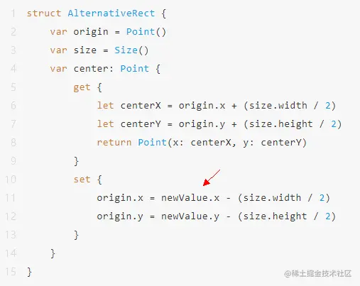如上,Swift 的 computed property 支持 Shorthand Setter Declaration 写法_[7]_,即可以省略 set(value) {},用约定式变量 newValue 访问 setter 参数。