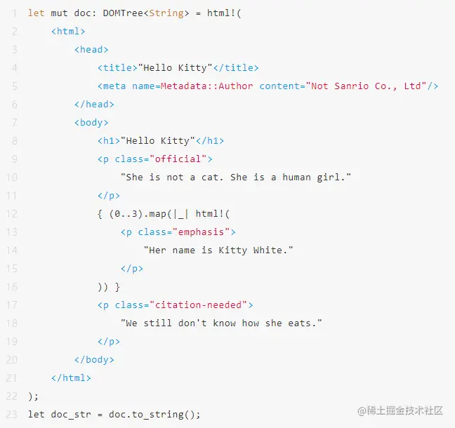 如上,rust 的 typed_html 提供了 html! macro,让开发者可以在 rust 代码里,编写 html 标签结构。
