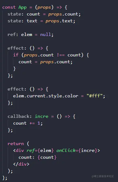 如上,我们用 state: 表达 useState,用 effect: 表达 useEffect,用 callback: 表达 useCallback。组件代码写起来,更加规整和简洁。