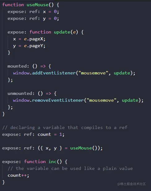 如上,用 expose: 来表达组件对外的输出,用 mounted: 表达 onMounted,用 unmounted: 表达 onUnmounted。