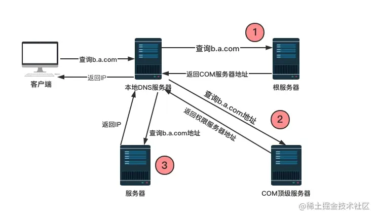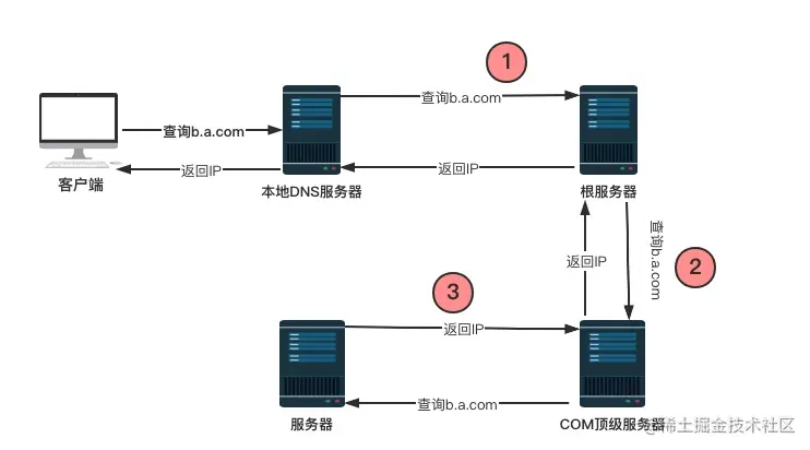 - 3.根服务器返回给本地DNS服务器查询域,然后本地DNS服务器再次去查询