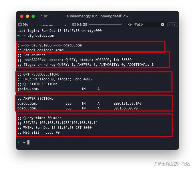 - 第五部分则是本次查询的一些统计信息,比如用了多长时间,查询了哪个 DNS 服务器,在什么时间进行的查询等等。