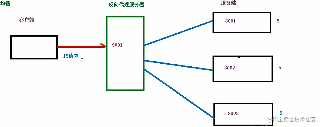 假设有15个请求发送到代理服务器,那么由代理服务器根据服务器数量,平均分配,每个服务器处理5个请求,这个过程就叫做负载均衡。