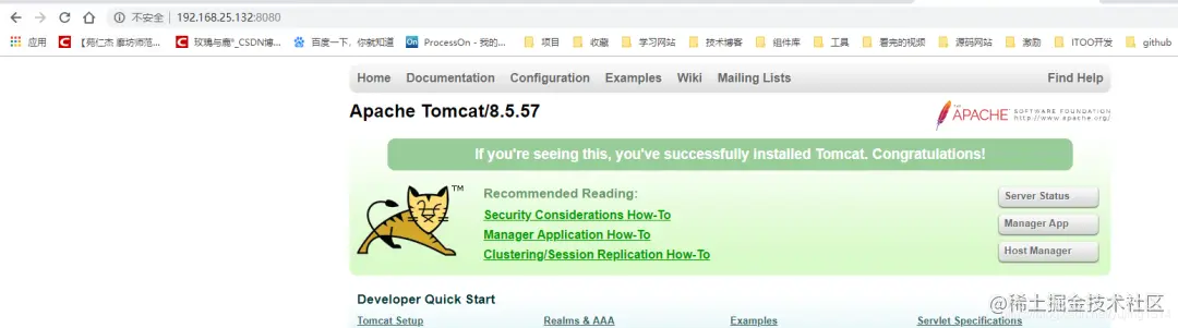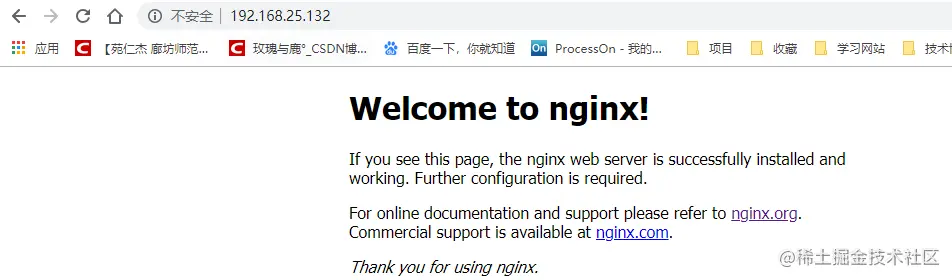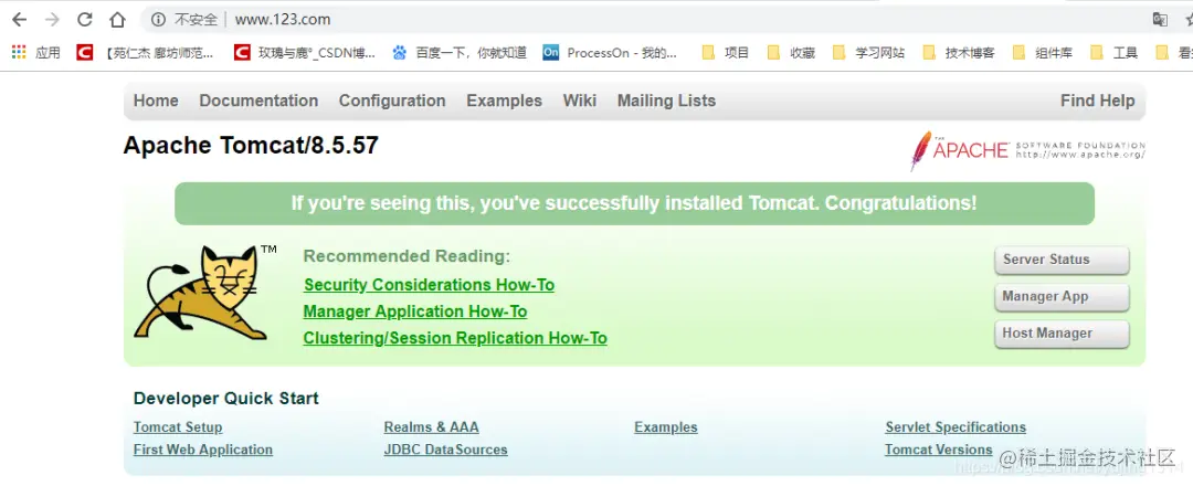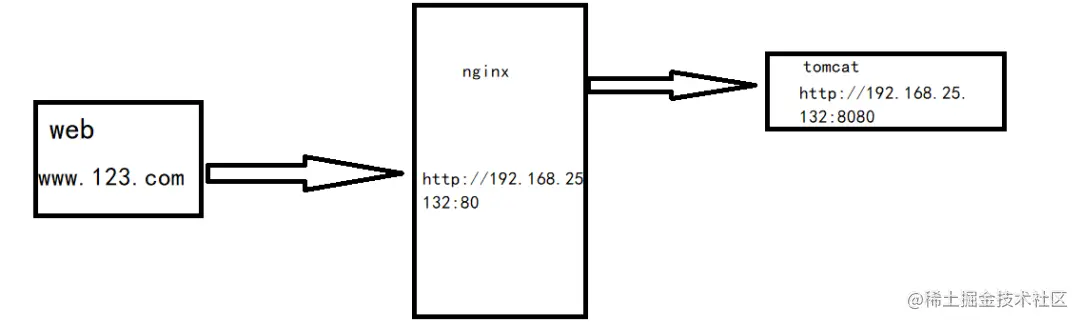 第一个例子:浏览器访问www.123.com,由host文件解析出服务器IP地址192.168.25.132 www.123.com,然后默认访问80端口,而通过Nginx监听80端口代理到本地的8080端口上,从而实现了访问www.123.com,最终转发到tomcat 8080上去。