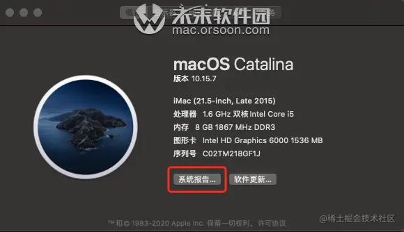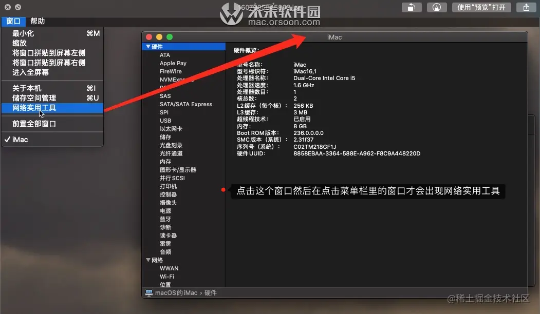 点击左上角的苹果标->点击关于本机->点击系统报告->点击菜单栏上的窗口