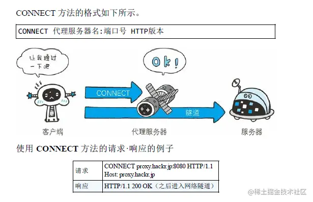 CONNECT方法。要求隧道协议连接代理 CONNECT方法要求在与代理服务器通信的时候建立隧道,实现用隧道协议进行TCP通信。主要使用SSL(secure sockets layer,安全套接层)和TLS(Transport Layer Security,传输层安全)协议把通信内容加密后经过网络隧道传输。 CONNECT方法的格式如下: CONNECT代理服务器名:端口号 HTTP版本