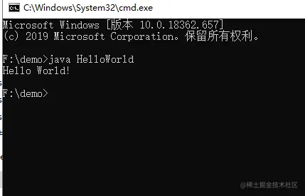 编译成功后,命令行是没有任何提示的,在这个目录里可以看到新产生一个文件,HelloWorld.class,该文件就是编译后的文件,是Java虚拟机可以运行的文件,也叫字节码文件,有了字节码文件接下来就该运行了