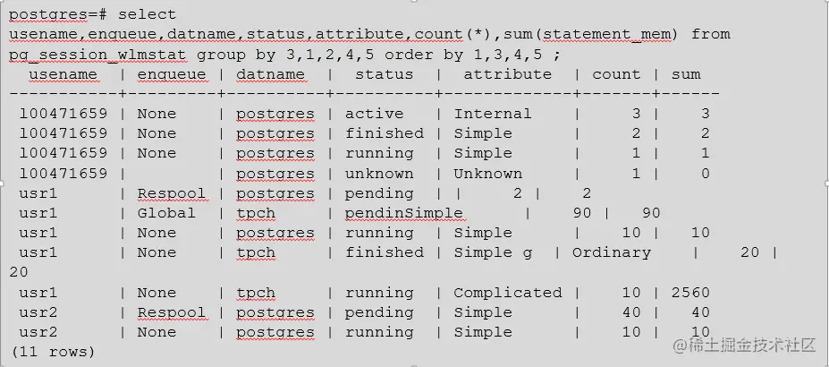 上图中说明当前连接的cn中有用户名为usr1的用户执行作业,并且在资源池上排队(第一节介绍的resourcepool队列),数据库为postgres,作业在排队所以当前status为pending状态。
