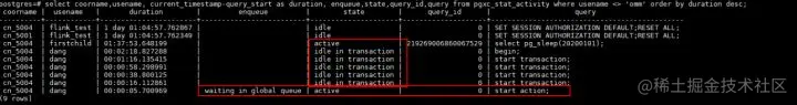 - 连接被空闲事务占用:如上图中情况,可以看到有很多连接的状态都是idle in transaction,这种状态处于事务块完成但是没有提交,也会占用一个并发,导致其余作业并发量减小,导致排队。此类情况需要排查业务应用的执行情况,整改业务,避免处于这种空闲还占用并发的情况。严重阻塞业务的情况,紧急处理可以将该类语句直接terminate掉。