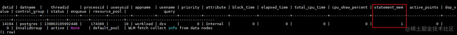 - 根据图中的现象,我们看到很多语句都在排队,这时候要查询一个排队视图:select * from pg_stat_get_workload_struct_info();